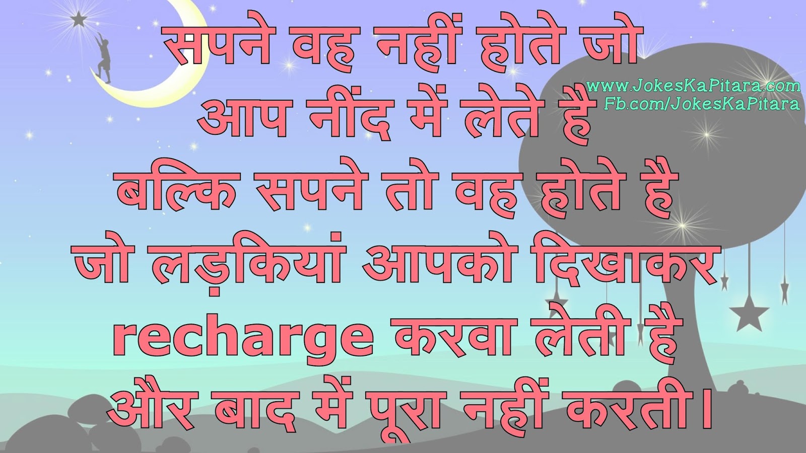 HomeChutkaleसुपनो का असली मतलब #Jokes सुपनो का असली मतलब #Jokes Nikhil Jain July 9, 2017 Chutkale, Gf Bf Jokes, Hindi Jokes, चुटकले, चुटकलों वाले विचार No Comments सपने वह नहीं होते जो आप नींद में लेते हैबल्कि सपने तो वह होते हैजो लड़कियां आपको दिखाकरrecharge करवा लेती हैऔर बाद में पूरा नहीं करती। Tweet Pin It Related Posts औरतों की सोच भी कैसी अजीब है न…..? कोई मुझे बताएगा कि जो लोग कही के नही रहते… जानिए इंसान का दिमाग कब दो बार काम करना बंद करता है… About The Author Nikhil Jain Leave a Reply Cancel reply Save my name, email, and website in this browser for the next time I comment. Δ